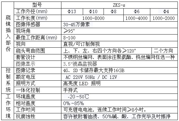 我公司推出一款新型工业内窥镜,它集便携性、灵活性、高性能为一身,完美展现清晰的检测图像,探头具有一定程度的防水和防腐功能,可满足各种恶劣环境的工业检测要求;系统集成了高分辨率的CCD和最新的多层镀膜物镜结合以及高亮度LCD显示屏,没有繁琐的连接附件,操作极为简单。广泛受到新老用户的一致好评。 产品特点: ★轻巧便携,手持式操控一体化,重量轻携带方便; ★3.5英寸高亮度LCD显示屏,确保较高的图像质量; ★采用低照度高清摄像镜头,在低照度的环境中亦能达到较为理想的 检测效果; ★机械探头摆动操控简单灵活; ★锂电供电装置,连续工作长达8小时; ★存储装置 4G SD卡可对被检测图像实现:实时摄像、拍照、录像、存储、回放、删除、检测时间及日期设定;可实时对被测物进行2X放大或缩小并可拍照;回放时,可对画面进行8X缩放;检测后,可将SD卡取出,与计算机连接读取、处理。
